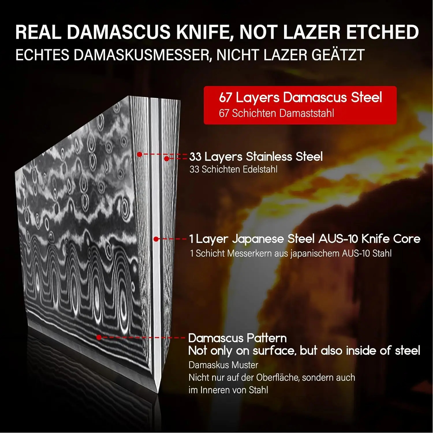 The VivaKnives™ 6.5-inch Nakiri Chef Knife is crafted from 67-layer Damascus stainless steel, combining sharpness, durability, and corrosion resistance. Designed for professional chefs and home cooks, this all-purpose Nakiri knife is perfect for slicing, chopping, and dicing vegetables, fruits, and meats with precision.